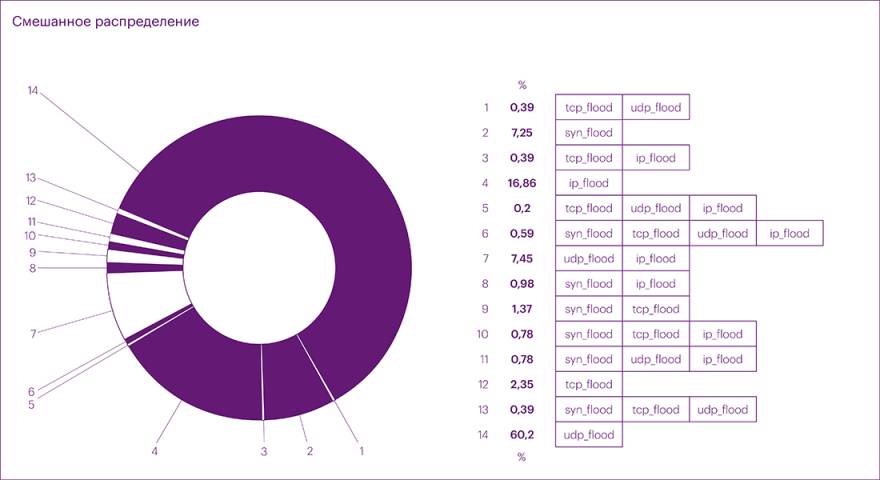 Четвертый квартал прошедшего года не преподнес никаких сюрпризов в части распределения смешанных атак по векторам. UDP флуд вновь оказался на первом месте с показателем 60,20%. На второй строчке расположился IP флуд - 16,86%. В тройку лидеров также вошли мультивекторные атаки - 13,36%. В целом, показатели распределились следующим образом: