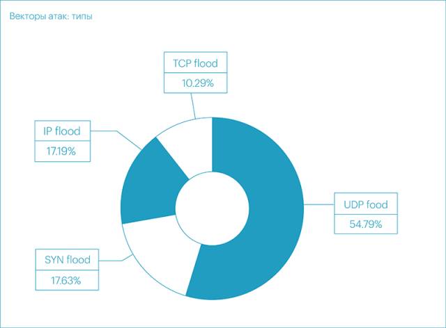 В итоге общегодовые показатели векторов атак распределились следующим образом. В смешанных значениях лидирует UDP флуд, за ним следует SYN флуд, и замыкают тройку лидеров мультивекторные атаки:
