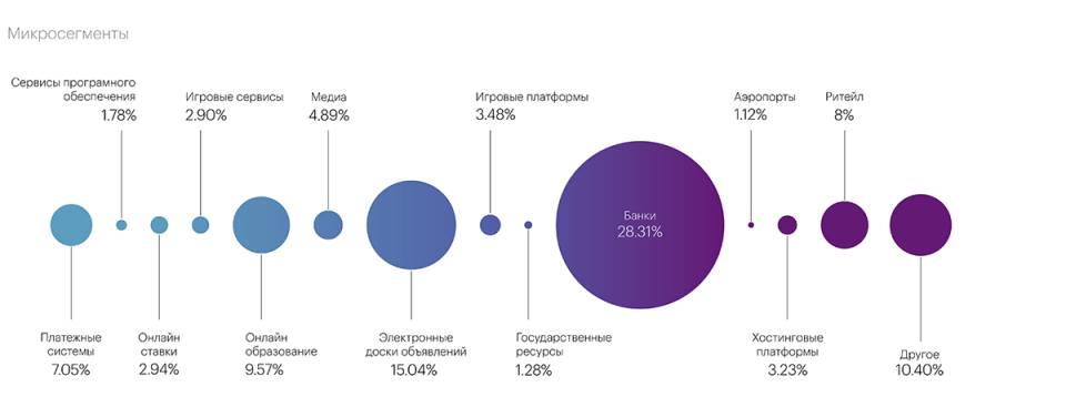 По результатам года в микро сегментах ТОП 5 самыми атакуемыми оказались Платежные системы - 12,81%, ИТ сервисы - 11,85%, Продуктовый онлайн ритейл - 11,43%, Онлайн-магазины - 10,76%, Банки - 10,56%.