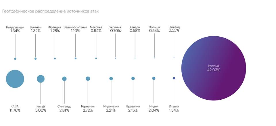 Статистика распределения атак по географическим источникам в четвертом квартале еще раз акцентирует внимание на тренде, прогрессировавшем в течение всего 2023 года: злоумышленники научились с успехом обходить блокировки по GeoIP, и существенная часть трафика атак теперь генерируется локальными источниками, максимально близкими к региону жертв.