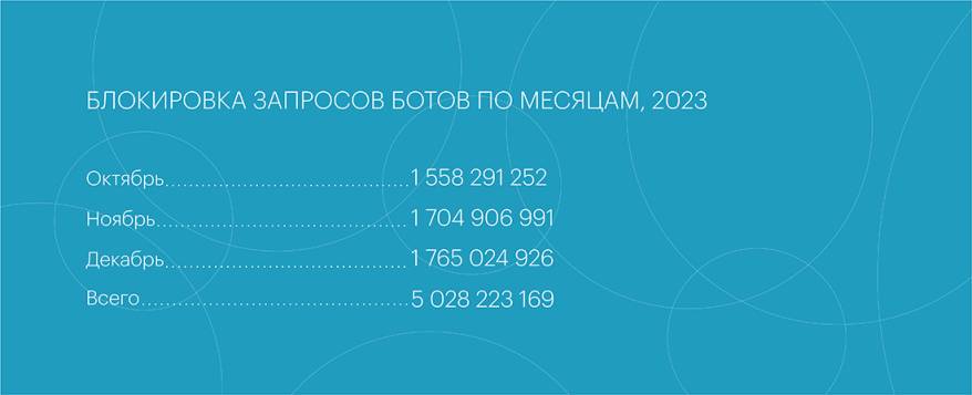 Четвертый квартал стал пиковым периодом 2023 года по уровню бот-активности. Его показатели почти в 2 раза превысили количество атак ботов в первом квартале, увеличившись с 3 027 064 142 до 5 028 223 169 запросов. В сравнении с третьим кварталом, число атак ботов также существенно возросло – на 32%. Самым активным месяцем 4 квартала стал декабрь, на который пришлось 1,77 млрд. заблокированных запросов ботов.