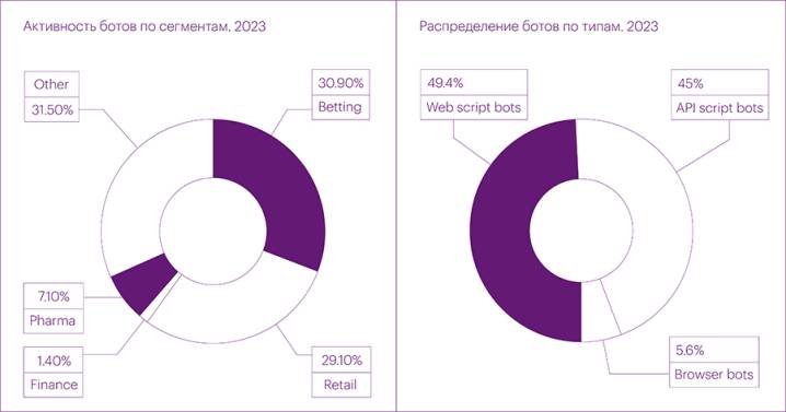 В сравнении, в сфере беттинга подобных всплесков нет: там нагрузка более ровная. Однако этот сегмент продолжает удерживать первые позиции, достигнув доли в 30,9% всех бот-запросов в 4 квартале. Сегмент фармацевтики несколько стабилизировался после скачка в третьем квартале: бот-активность в нем снизилась на 25%.