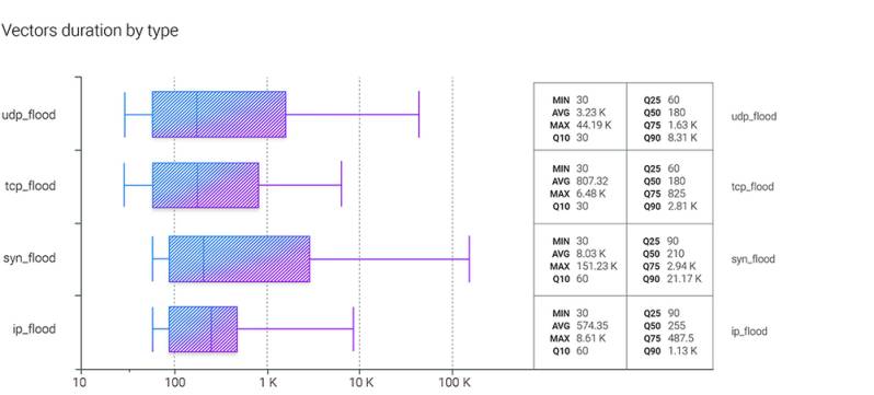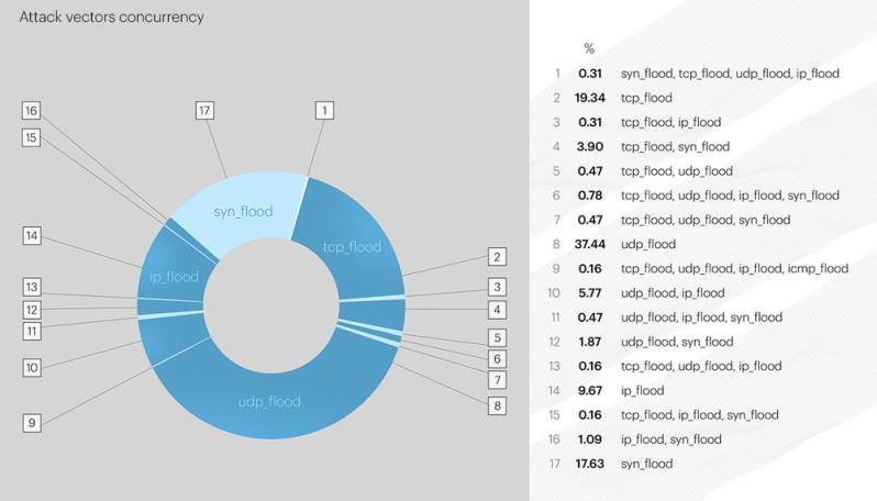 Такая картина становится более или менее стандартной: SYN-флуд с наибольшей продолжительностью, за ним следует UDP-флуд, а затем IP-флуд, причем последние два иногда меняются местами.