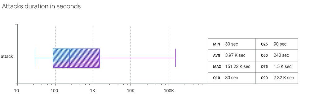 В первом квартале 2023 года продолжительность атак увеличилась практически по всем показателям. Среднее время атаки значительно выросло, по сравнению с предыдущим кварталом: с 2503 секунд в четвертом квартале до 3970 секунд в первом квартале 2023 года. Медианная продолжительность также возросла — с 210 до 240 секунд.