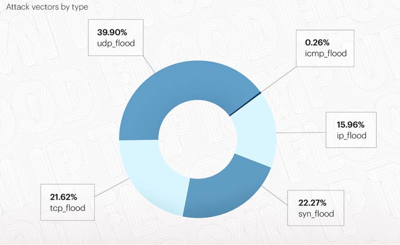 В статистике чистого распределения (без смешанных) векторов атак мы видим, какой вектор набрал наибольшее "количество голосов", по сравнению с предыдущим кварталом — это UDP-флуд, доля которого в первом квартале 2023 года составила 39,9%.