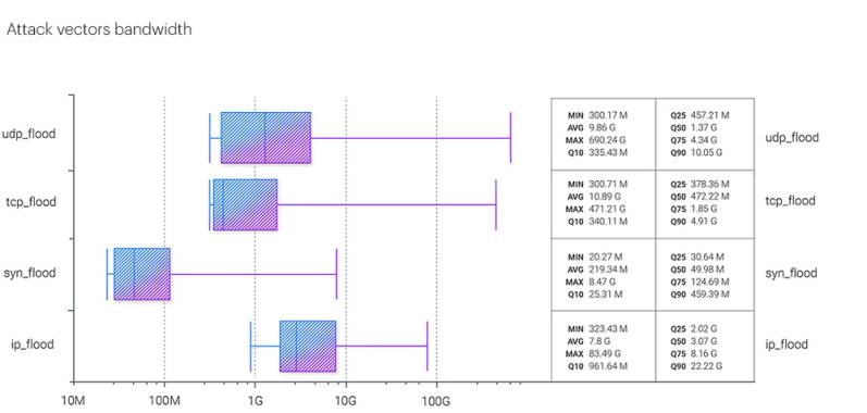 В первом квартале 2023 года среднее значение битрейта атак составило 7,59 Гбит/с, что, вероятно, является самым низким показателем за все время нашего наблюдения. Это число относится только к volumetric атакам.
