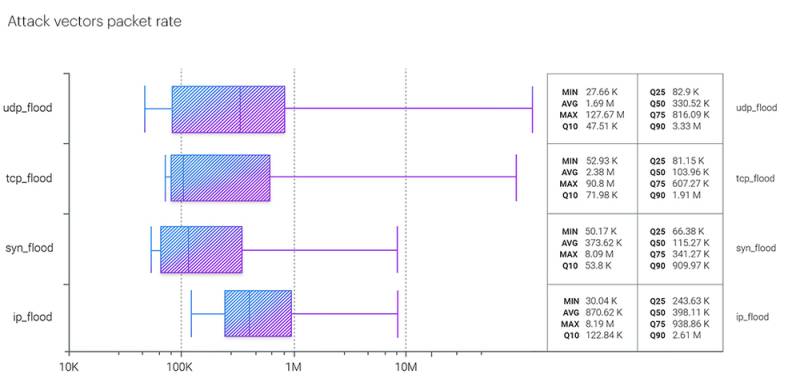 Как и в 4 квартале 2022 года, битрейт UDP-флуда и TCP-флуда имеет более высокие максимумы — 690,23 Гбит/с и 471,21 Гбит/с соответственно. Тенденция изменения медианного значения схожа с предыдущим кварталом – на этот раз значение битрейта UDP-флуда составляет 1,37 Гбит/с, что все еще более чем в два раза ниже медианного значения битрейта атак для IP-флуда — 3,07 Гбит/с.