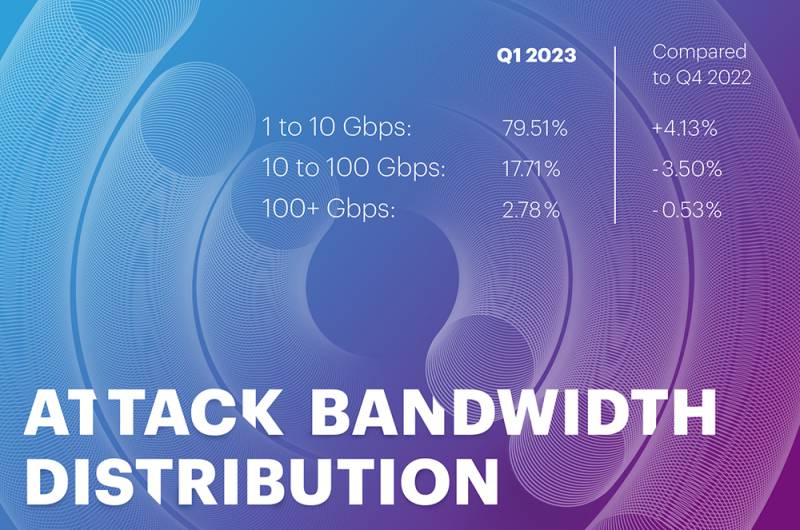 В первом квартале 2023 года большинство нападений сместилось в наименьший диапазон (от 1 до 10 Гбит/с), где теперь наблюдается почти 80% всех volumetric атак.