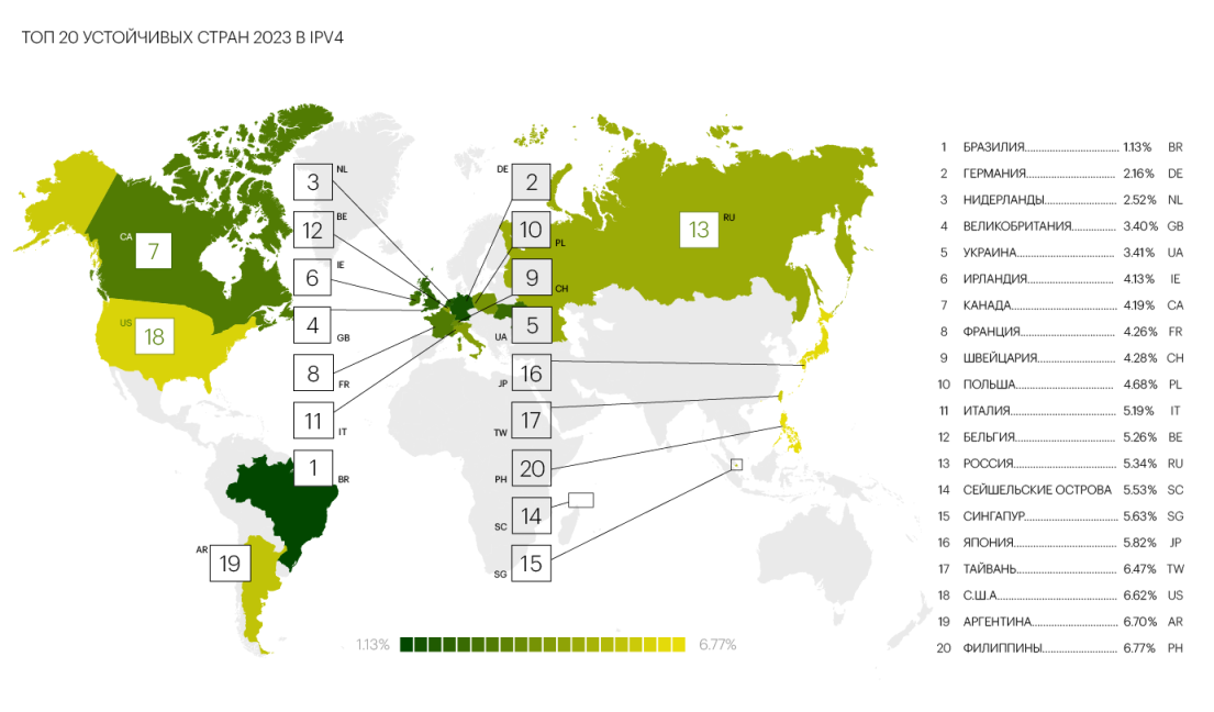 - Устойчивость IPv4 год от года продолжает улучшаться, демонстрируя рост с 26,7% в 2022 году до 25,72% в 2023-м.