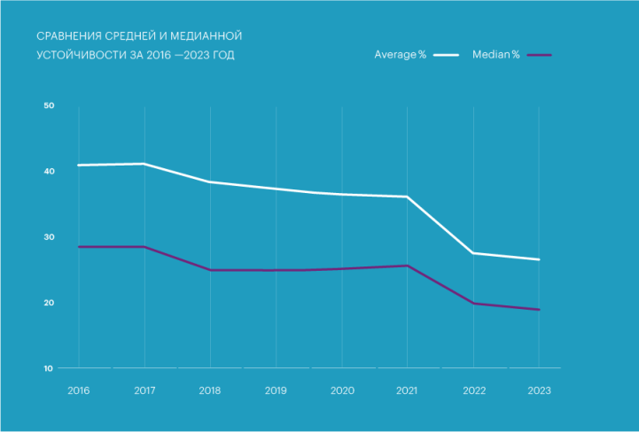 Для иллюстрации данного тезиса мы отобразили средние и медианные значения IPv4-устойчивости по всем странам за всю историю выпуска отчета (последние 8 лет).