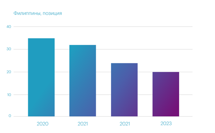 - Спустя 7 лет отсутствия, Филиппины вернулись в рейтинг на 20 позицию, в 2022 году были на 24 месте,