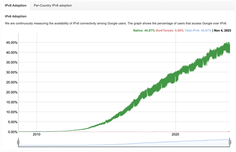 Многим известно, что, несмотря на похожее название протоколов IPv4 и IPv6, их реализация совершенно разная. Конечно, относительная новизна и существенные отличия в работе этих двух протоколов замедляют темпы внедрения IPv6-маршрутизации в Интернете. Это подтверждает статистика использования IPv6 от Google, которая показывает, что распространение этого протокола в мире растет, но не экспоненциально, что присуще многим интернет-технологиям, а линейно (график иллюстрирует процент от всех сеансов, использующих IPv6 для подключения к серверам Google). Тем не менее, за 8 лет публикации нашего отчета этот параметр вырос с 10 до 44,87% в 2023 году.