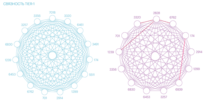Связность Tier-1 IPv4 (слева) и Tier-1 IPv6 (справа)