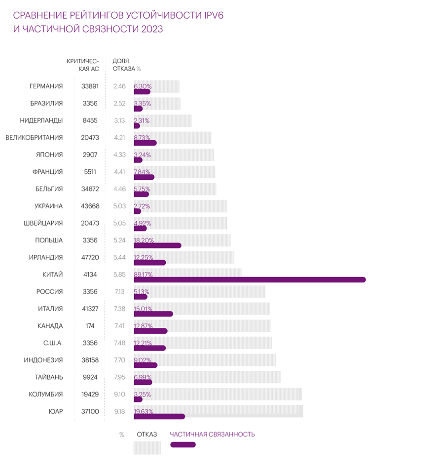 Практически ежегодная смена лидеров свидетельствует о динамичности развития IPv6. Отметим, что в отличие от IPv4 средняя устойчивость и частичная связанность для IPv6 не улучшается. Однако если посмотреть на лидеров рейтинга (первые 20 стран), для которых, очевидно, надежность является одним из приоритетов, то можно видеть улучшения в средней доле отказа – с 7,06% в 2022 до 5,34% в 2023.