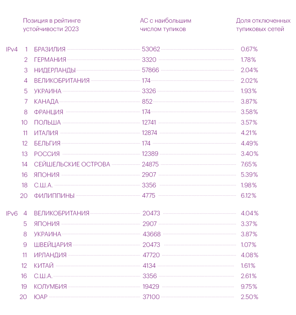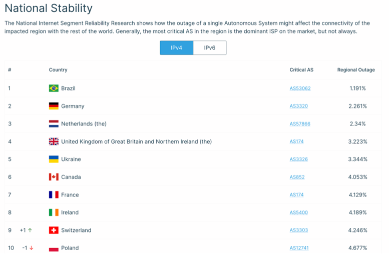 Рейтинг отказоустойчивости интернета который год подряд демонстрирует устойчивый тренд планомерного улучшения связности. Бразилия, Германия, Нидерланды прочно удерживаются в Топ-3 уже два года, а значит, число связей между их автономными системы настолько велико, что отказ критической автономной системы не приведет к недоступности этих регионов.