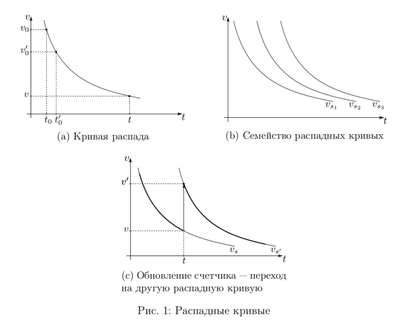 Идея распадных счетчиков навеяна известной концепцией радиоактивного распада [4]. Ее суть состоит в том, что с течением времени количество нераспавшегося вещества уменьшается со временем по экспоненциальному закону: