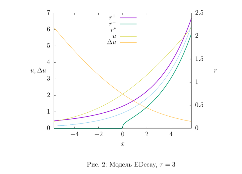 Рисунки 2,3,4 иллюстируют свойства моделей: оттенками желтого показаны графики функций \(u(x)\) и \(\Delta u(x)\), остальные графики — оценки интенсивности. Параметры моделей были подобраны таким образом, чтобы показать разницу между верхней и нижней оценкой. На практике мы используем такие значения параметров, чтобы оценки были поточнее. Если же, например, для модели EDecay взять \(\tau\) побольше (например, у нас в рабочем коде \(\tau\) составляет порядка \(10^8\)), то графики оценок визуально слипнутся, что, очевидно, свидетельствует о высокой точности модели.