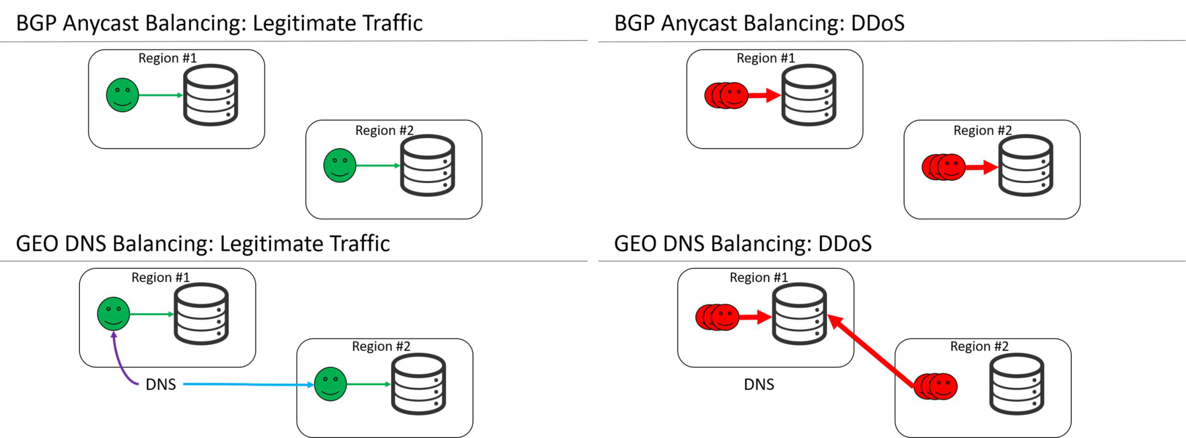 Исторически балансировка трафика с использованием GeoDNS была популярна среди CDN-провайдеров (CDN — content delivery network). По сравнению с BGP Anycast, GeoDNS легко реализовать и контролировать, есть целый набор практически готовых решений. Однако то, что применимо к CDN, не всегда применимо к сервисам по фильтрации трафика. Так, в отличие от обычных пользователей, боты могут спокойно игнорировать выдачу локального DNS-сервера и могут легко создать перегрузки в отдельном регионе, в итоге выводя даже гео-распределенные сети из работоспособного состояния.