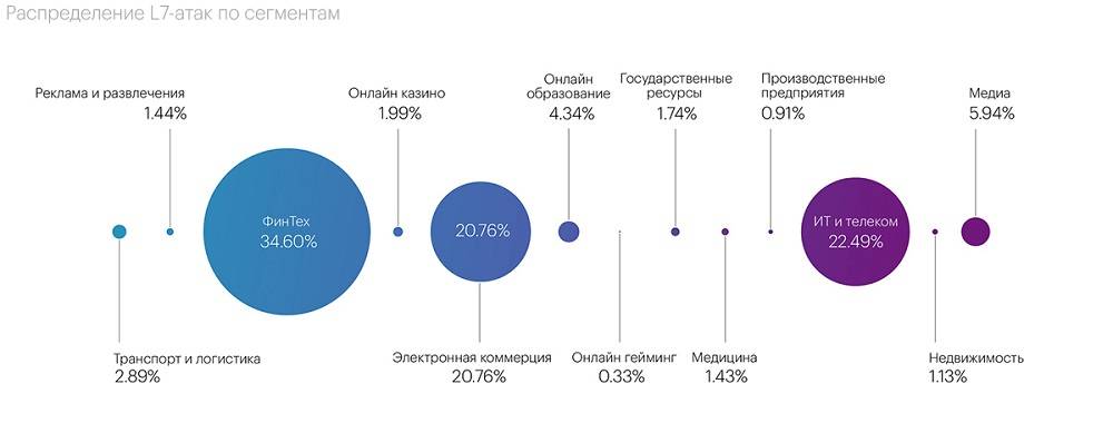 - Наибольшее количество атак на уровне L7 пришлось на сегмент Финансовых технологий - 34,60%. На втором месте – сегмент ИТ и Телеком - 22,49% всех атак, а замыкает тройку Электронная коммерция - 20,76%.