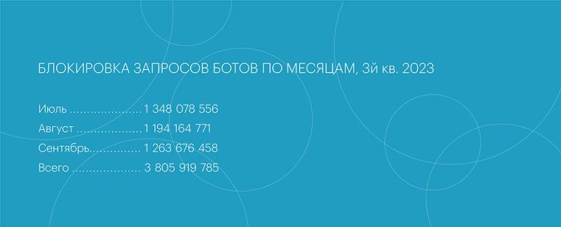 В сравнении со вторым кварталом, количество атак ботов сократилось на 10%, составив 3 805 919 785. Пиковые значения в третьем квартале оказались меньше, не было рекордных по объему и продолжительности бот-всплесков, которые выделялись бы относительно повседневной активности. Самым активным месяцем 3 квартала стал июль, на который пришлось больше всего атак: 1,35 млрд. заблокированных запросов ботов.