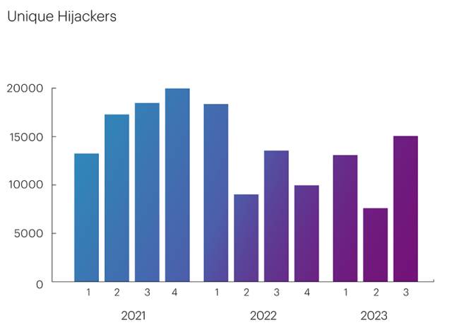 Третий квартал этого года, тем не менее, стал исключением из правил, возросшие показатели которого резко выделились на фоне общего падения числа BGP Hijackers.