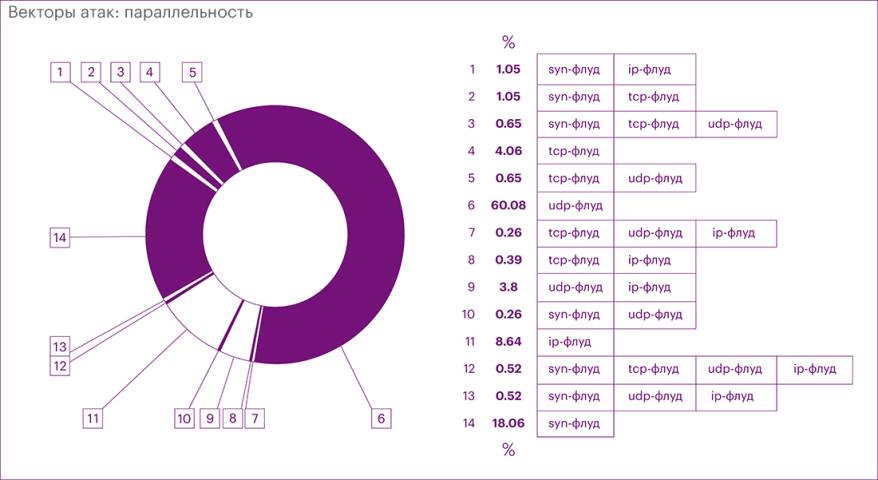 Как и в анализе с учетом смешанных векторов, в процентном соотношении и в продолжительности атак мы видим ту же динамику: общее снижение доли TCP flood, стабильно высокий показатель SYN flood и увеличение доли UDP flood и IP flood.