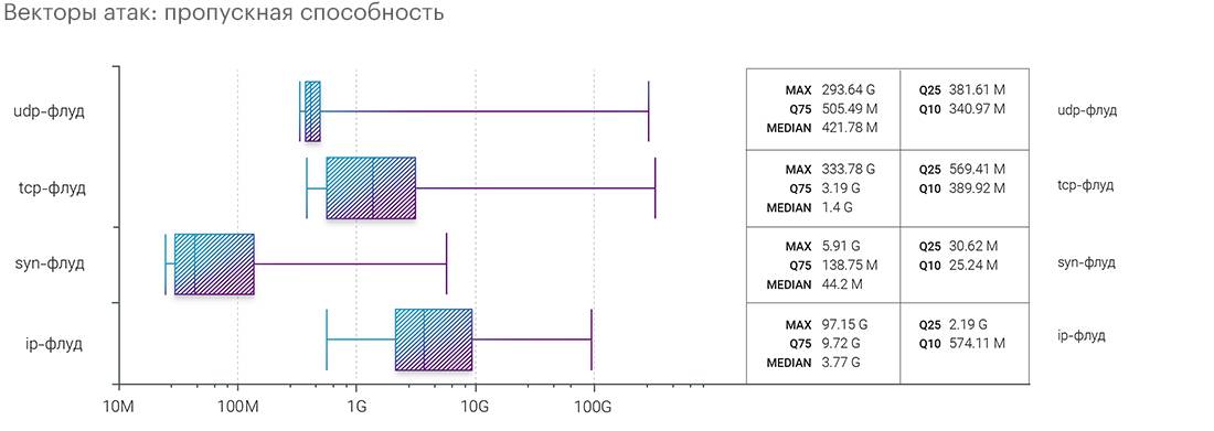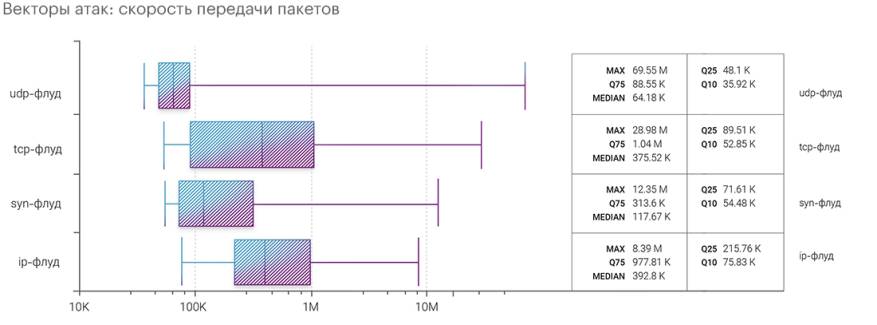 Расстановка показателей битрейта относительно предыдущих двух кварталов изменилась незначительно. Битрейт TCP-флуда и UDP-флуда имеет более высокие максимумы. Медианное значение векторов атак, по сравнению с предыдущим кварталом, снизилось, но общая расстановка значений также не изменилась – в этом квартале значение битрейта SYN flood и UDP flood по-прежнему ниже значений TCP flood и IP flood, и составляют 44,2 Мб/с, 421,78 Мб/с, 1,4 Гб/с и 3,77 Гб/с.