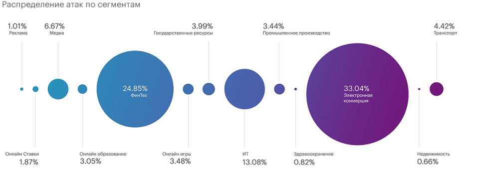 Наибольшее количество атак во втором квартале на уровне приложений пришлось на сегмент электронной коммерции - 33,04%, который, как упоминалось ранее, на уровне L3-L4 OSI занял вторую строчку. А вот сегмент финтеха на уровне L7 интересовал злоумышленников чуть меньше - 24,85% от всех атак. Замыкает тройку лидеров сегмент информационных технологий и телекоммуникаций - 13,08%. В то же время сегмент электронного образования, который на уровне инфраструктуры занимает 3 строчку, на L7 не вошел даже в ТОР 5.