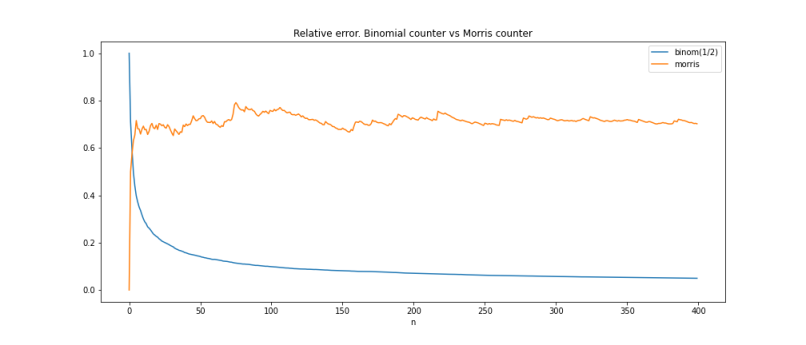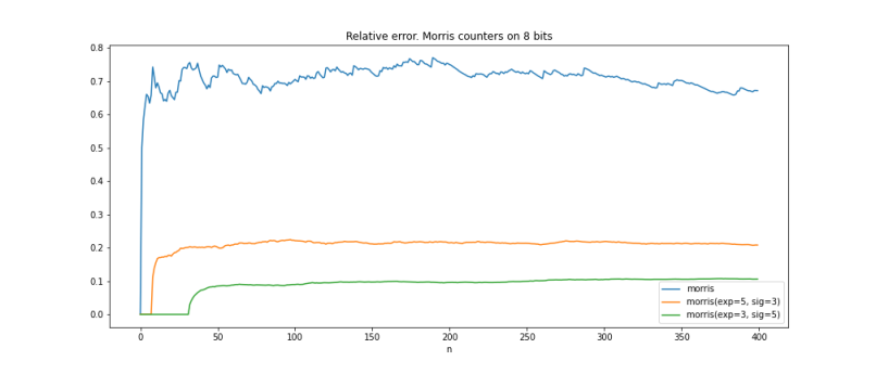 Таким образом, относительная ошибка оценки числа событий при использовании счётчика Морриса ограничена, примерно постоянна и почти не зависит от \(n\).