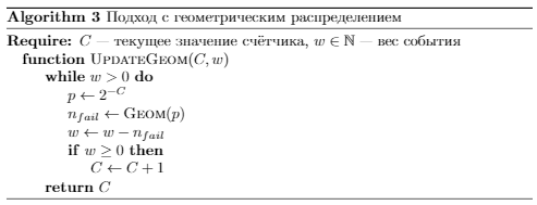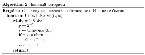 При реализации потоковых алгоритмов часто возникает задача подсчёта каких-то событий: приход пакета, установка соединения; при этом доступная память может стать узким местом: обычный \(n\)-битный счётчик позволяет учесть не более \(2^n - 1\) событий.