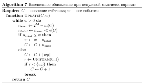\(\begin{align*} C_{n+1} &= \left\{\begin{array}{ll} C_n + 1, & \textit{с вероятностью $2^{-{\rm e}(C)}$} \\ C_n, & \textit{с вероятностью $1 - 2^{-{\rm e}(C)}$} \end{array}\right. \\ \widehat{n}(C) &= (2^{{\rm e}(C)} - 1)2^{\bf M} + 2^{{\rm e}(C)}{\rm m}(C). \end{align*}\)