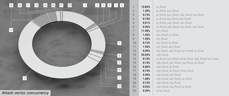 Наиболее крупный смешанный вектор - комбинированный UDP- и IP-флуд во втором квартале составил лишь 6,6% от общего числа атак, упав с 11,37% в первом квартале.