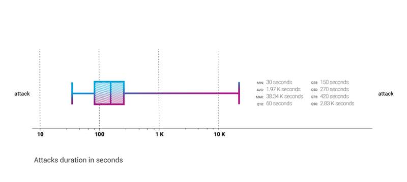 Глядя на разные перцентили, мы видим, что большая продолжительность атаки была почти универсальным правилом для атак второго квартала 2021 года. По сравнению с первым кварталом, во втором даже самые короткие атаки удвоились в продолжительности.