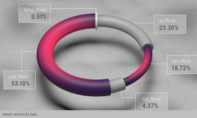 Как мы уже упоминали, с первого на второй квартал 2021 года изменилось распределение векторов атак. UDP-флуд вырос на 23%, IP-флуд упал на 17%, SYN-флуд на ~2,5% и TCP-флуд на 4%. Все атаки, которые составляли три последних вектора полгода назад, теперь переключились на утилизацию вектора UDP-флуда.