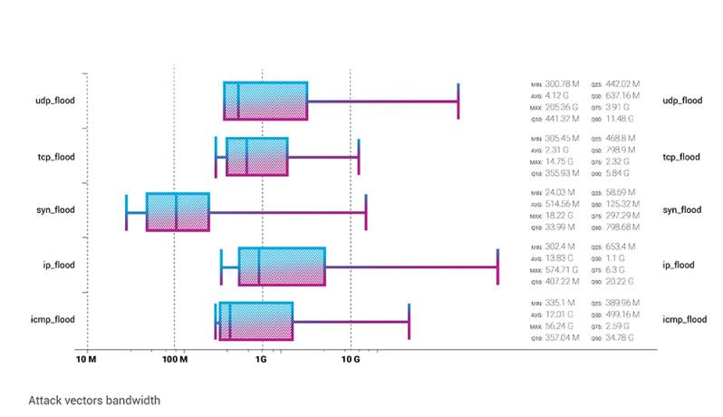 SYN-флуд показывает самый низкий средний битрейт среди всех векторов атаки - в среднем за второй квартал это 514 Мбит/с. И, наоборот, IP-флуд демонстрирует самый высокий средний битрейт - почти 14 Гбит/с.