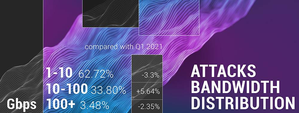 Интервал 10-100 Гбит/с получает все больше и больше атак в обоих кварталах 2021 года, что подразумевает значительный рост средней и минимальной битовой интенсивности атак. Сейчас более ⅓ всех атак приходится на сегмент 10-100 Гбит/с. по сравнению с 15% в 2020 году.