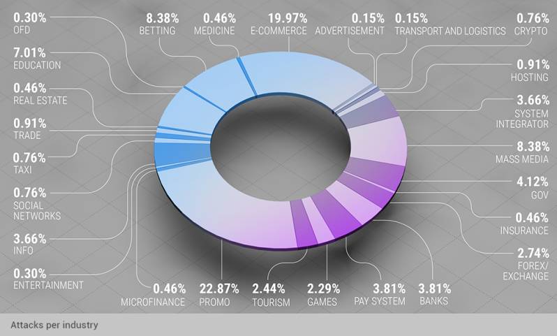 Промо-страницы, на которые приходится большая часть DDoS-атак в нашей статистике, могут представлять практически любую отрасль бизнеса, поэтому обычно мы не обращаем внимания на сегмент “Promo”, даже если он содержит почти четверть всех атак за второй квартал. Мы считаем, что это связано с тем, что проводятся активные маркетинговые меры по продвижению таких страниц (реклама), а DDoS-атаки исторически были эффективны в качестве меры нерыночной конкуренции.